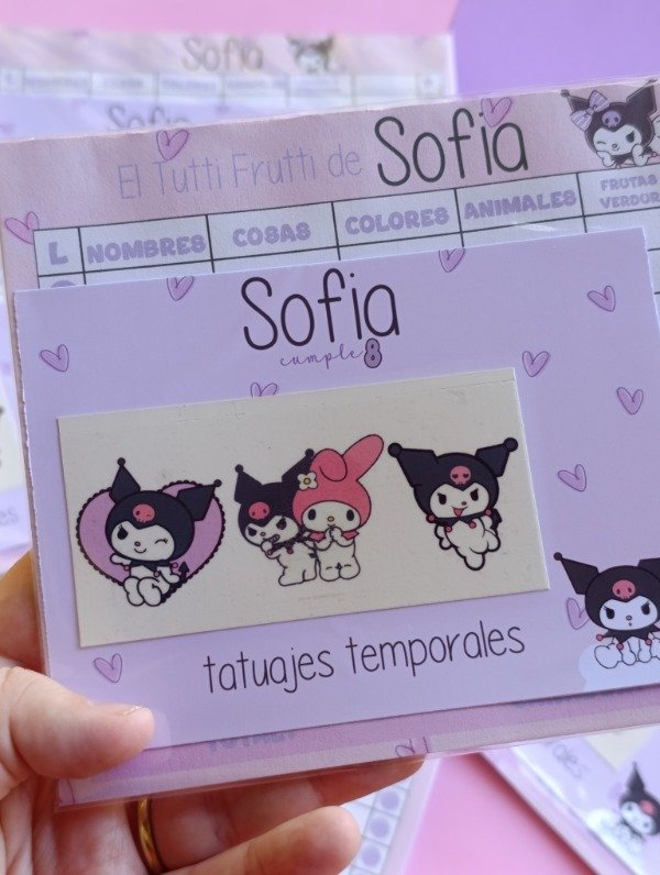 Vienen 3 tatuajes que tenes que recortar y aplicar. Los tatuajes son de personajes infantiles. Podes elegir la tematica, y tambien los personajes (tene en cuenta que deben tener fondo blanco o de un solo color).